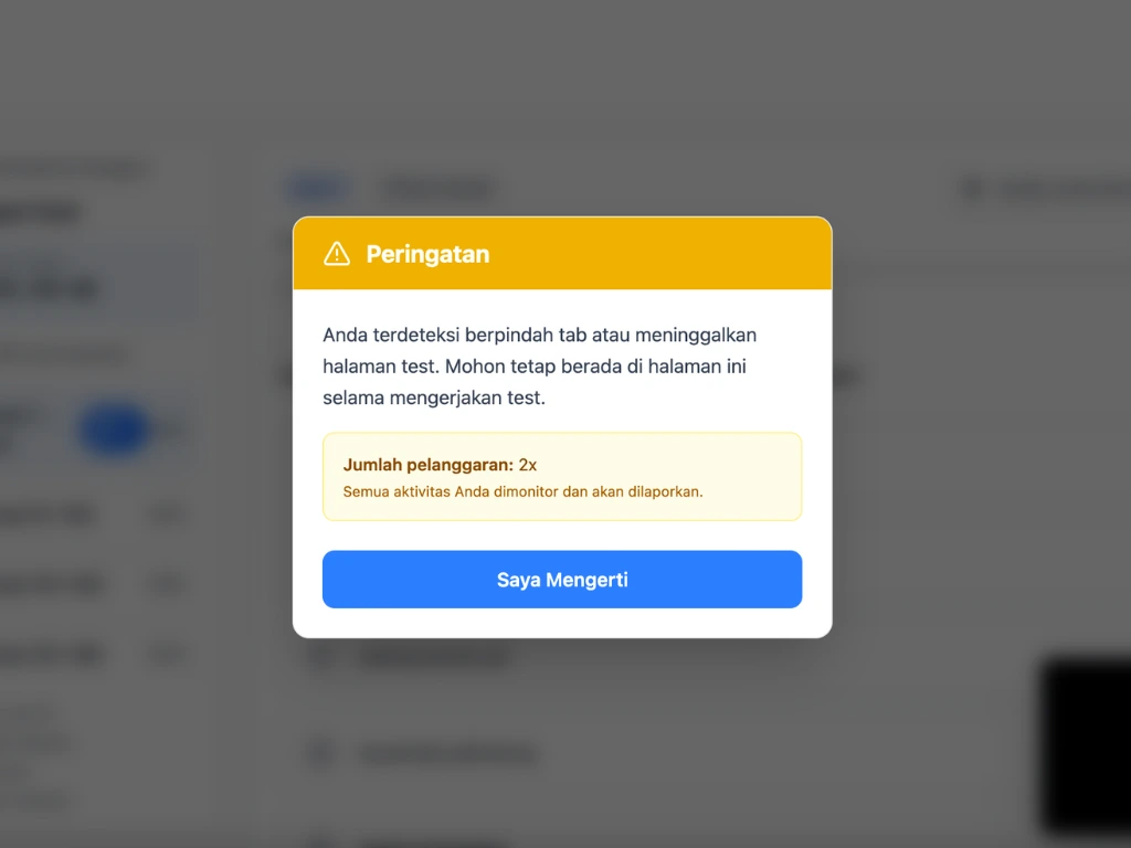 Sistem mendeteksi kamera aktif, mencegah copy–paste, dan memantau perpindahan tab. Memastikan tes dikerjakan dengan jujur.